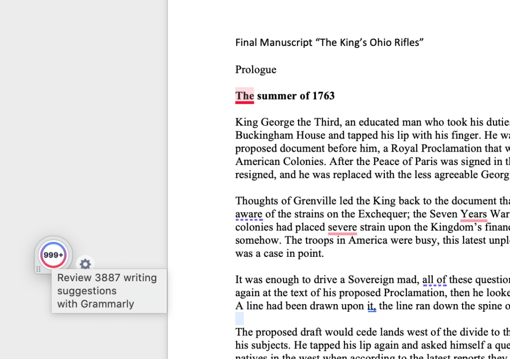 Note the window to the side, the Grammarly prompt with the number of edits for me to review on my rough draft manuscript of “The King’s Ohio Rifles,” book one of the upcoming Ohio Rifles trilogy. This is my foray into alternate history, and I would like to have it released on Amazon NLT 15NOV22.