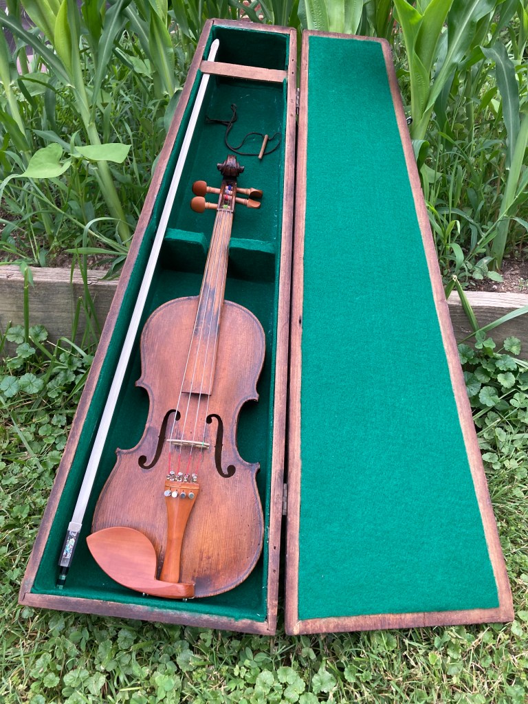 A quick recap. Several months ago, I found the violin and case illustrated above at a flea market. It was in sorry shape and needed a ton of TLC. When I bought it for forty dollars, I figured I didn’t have much to lose. Well, this violin became quite the quest. First, everything needed cleaning. Then the assembly and required refurbishing. There was a quick stop by my luthier, followed by adjustments and settling-in (the violin probably hadn’t been played since the fifties).