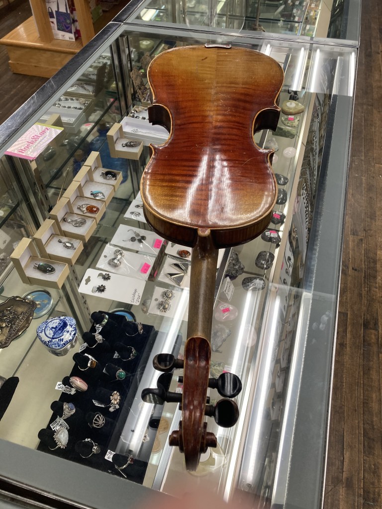 With this antique store violin, at least it had the standard tag beneath the left F-hole. Of course, the tag wasn’t helpful. It just says Stradivarius, like many old violins do. No, this does not mean that the famous violinmaker Stradivarius made the violin. It just means that the violin was copied from his pattern.