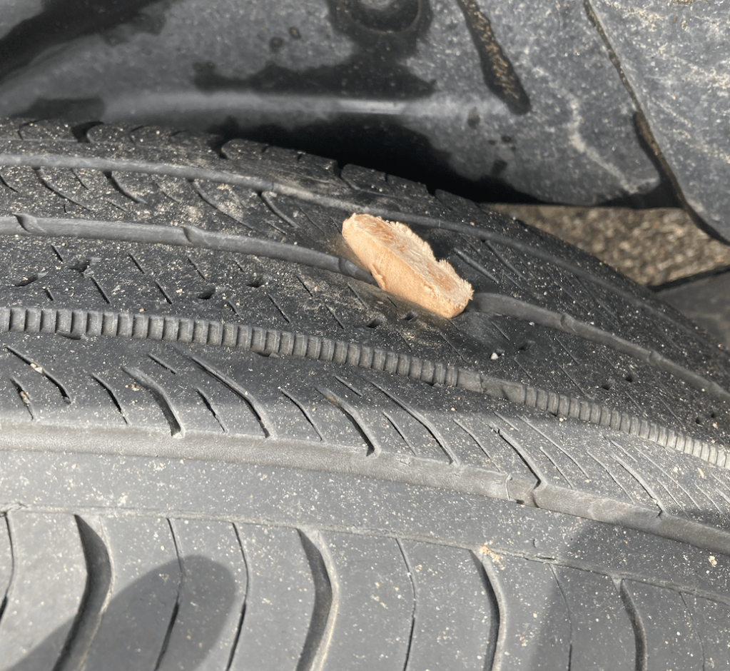 The flat was a result of this. A chunk of wood flew from a contractor’s truck, and I didn’t have time to dodge it. A quarter mile later, and my “low inflation” display came on, with a helpful diagram to let me know which wheel and it’s current pressure. 27 psi, and dropping fast. There was a problem. I looked for a good place to park, right away. Fortunately, there was an Aldi with a generous parking lot nearby. I whipped it into there with ten psi to spare.