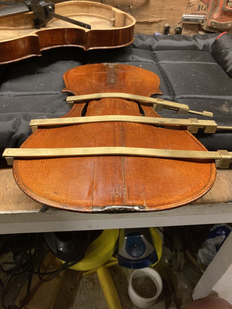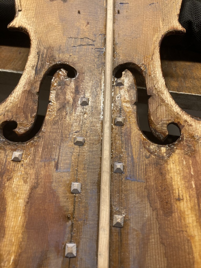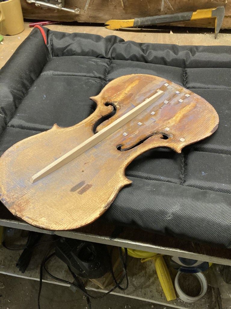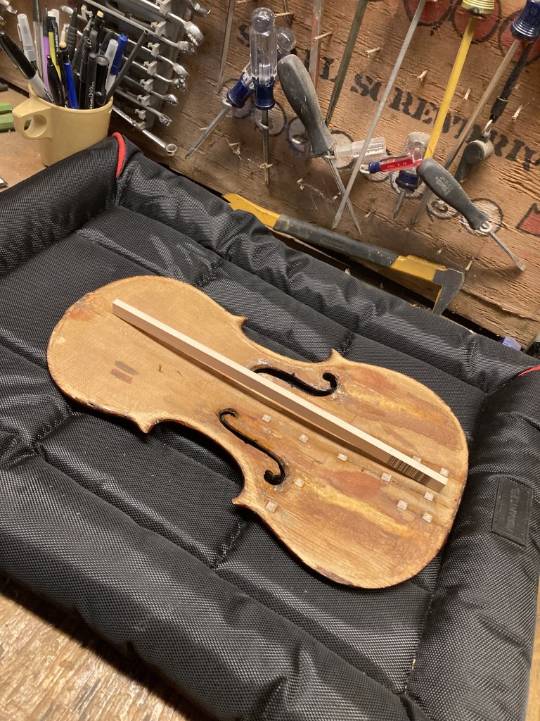 This is why sound post and bass bar installation is crucial. The left foot of the bridge rests upon the bass bar, and the right uses the sound post for support. As the strings tighten, the bridge is subjected to hundreds of pounds of stress- it must be perfectly straight and it must stand at exactly ninety degrees from the plate.