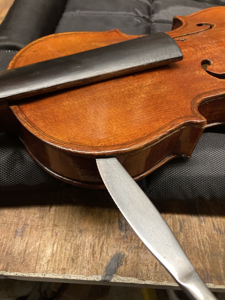 Do you see all that can go wrong here? Trust me, every last thing did as I learned how to do this. It sucked! A pic below of one of my unsuccessful attempts- I was using a standard luthier’s soundpost tool, and the stupid thing kept falling off as I tried to stand it up inside the dark cavity of the violin’s body while working through a 1/4in wide slot.