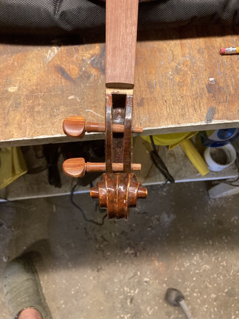 Then I moved onto the pegs. I have a special sharpener for these, it looks like an oversized kid’s pencil sharpener. What I didn’t realize was that the factory presets were entirely wrong for my violin, the blades were adjustable. Fortunately, I had a handful of very cheap pegs to practice on. I immediately destroyed three in my first attempts until I learned that I had to adjust the blades. Also, I found out that the taper of the individual instruments differs, so I had to customize the taper angle to get the pegs to fit well on my particular fiddle. Once I had it figured out, I carefully sharpened the rosewood pegs for this instrument. See below.