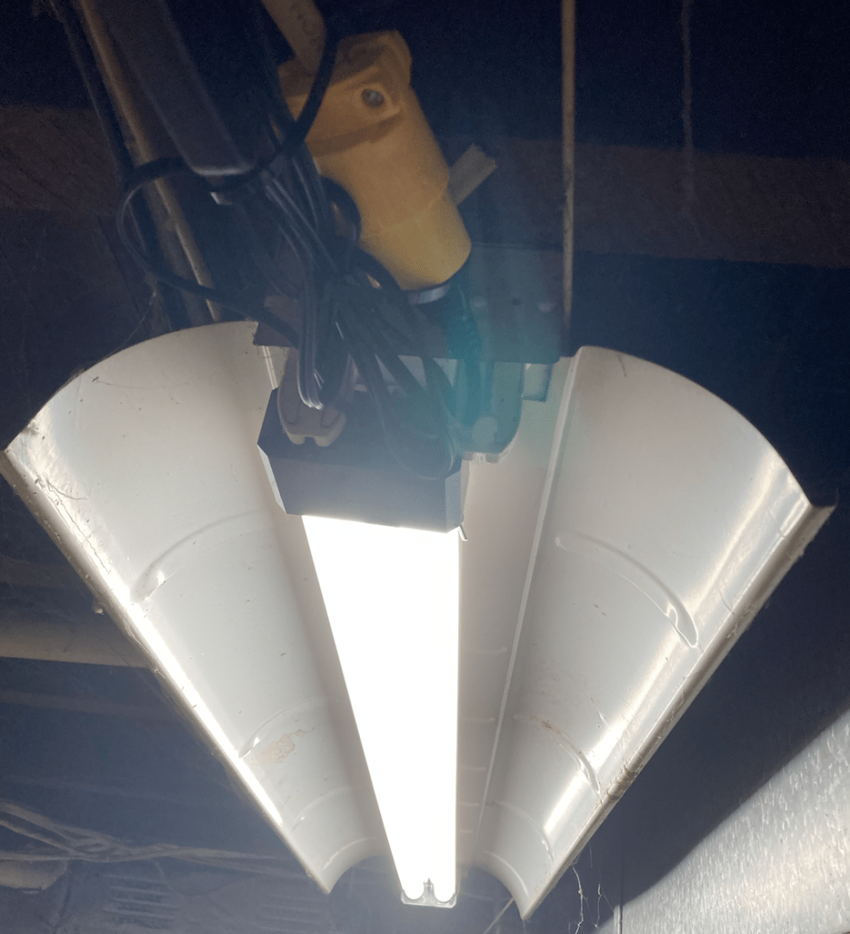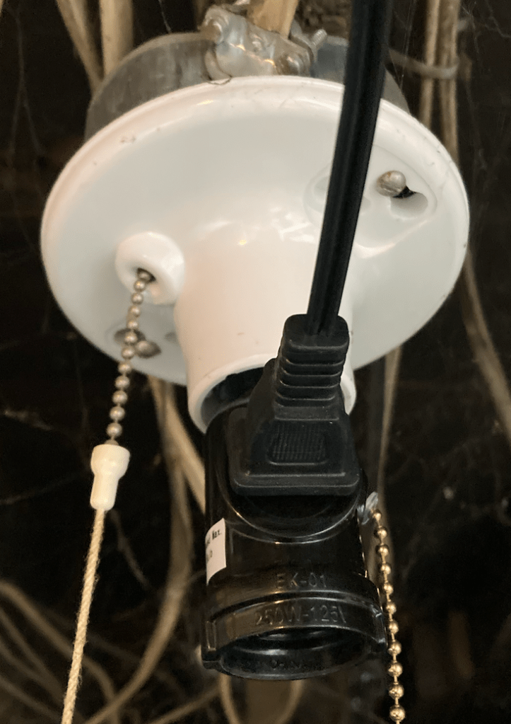 Alright, now that that’s been said, I did exactly as stated above. I de-energized the circuit and cut the wires. Then, I installed a female plug for the light. You could get fancy here and install a work box and hardwire the light’s cord, but for me, this was unnecessary. I jammed the replacement inside the now-dead old steel fixture and zip-tied it into place. I plugged it in, and it looked as if it had been made that way. Behold.