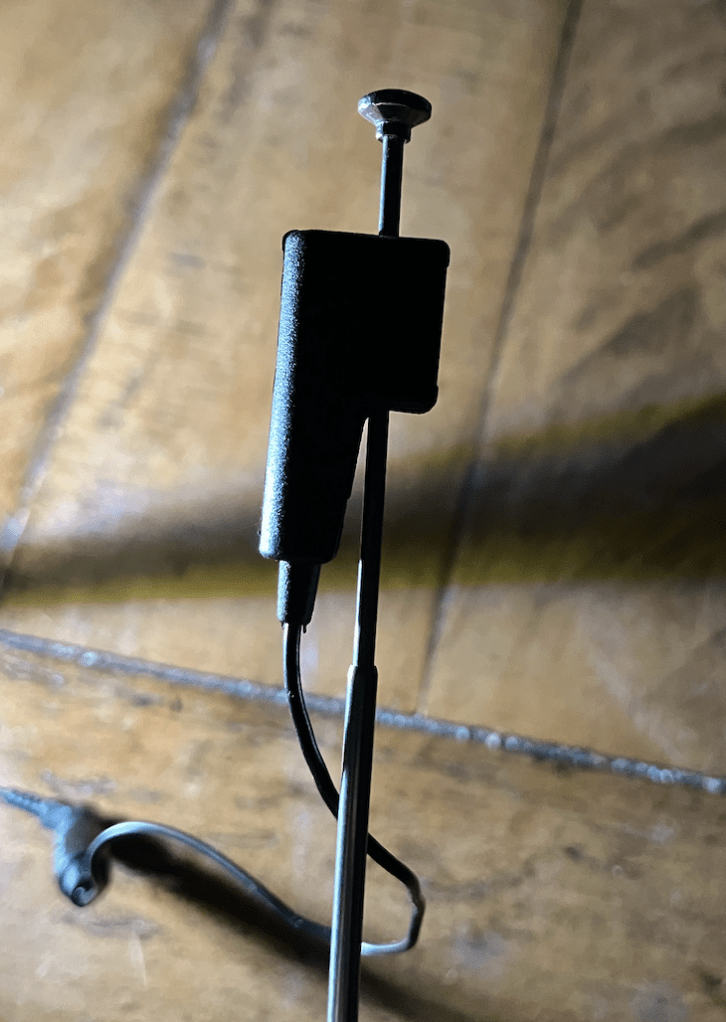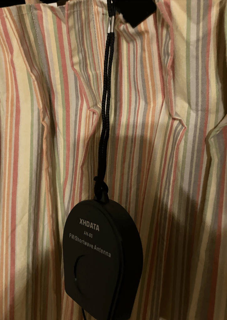 This is the AN-80 hanging from my curtain. It has a neat clip on the retractable spool end, and the other has a clip that securely fastens to your radio’s antenna. Pretty cool, inexpensive, and compact. Below is the antenna clip, fastened to the D-220’s antenna.