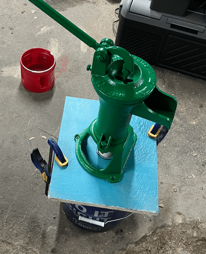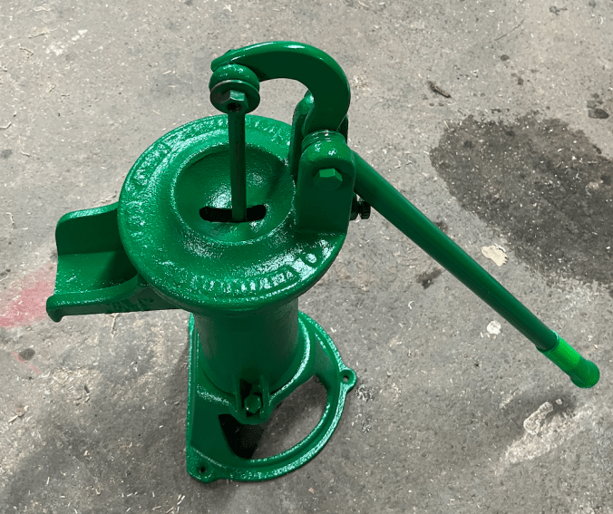 I am confident that it will give decades of service after this rebuild; I’ve taken seemingly useless, rusty junk and created something practically new and useful. See below for the final image. BTW, I chose dark green as the color because after treating the pump for rust, there were patches of the original paint remaining. It was dark green from the factory. I thought, “Why change a good thing?” So, I didn’t.
