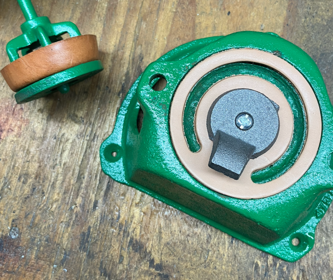 Around this time, I watched a YouTube video about rebuilding pitcher pumps. This was when I noticed I was missing yet another part, a cast iron weight that attaches to the bottom leather seal of the pump. It has two functions: One is to force the leather seal downward to trap water in the pump as you actuate the handle. Kind of important. The other is to allow water to drain rapidly in cold weather; you don’t want a bore full of water to freeze. This will irreparably damage the pump. It’s easy to prevent this; you simply leave the pump handle up, and the attached piston will force the weird little chunk of steel attached to the leather to open the crude check valve (A check valve only allows fluid to move in one direction) at the bottom of the jug, allowing water to drain back into the pipe. I ordered the part, once again on the Beast, and I was ready to assemble the pump when it came in. I used the two days to paint the pump with Rustoleum, the best outdoor paint ever. I did take care not to paint the pump bore: that’s not a great idea because the seal and piston will eventually cause tiny paint flecks to get into your water. The image below was that stupid little (but essential) part, assembled to the jug seal. Observe.