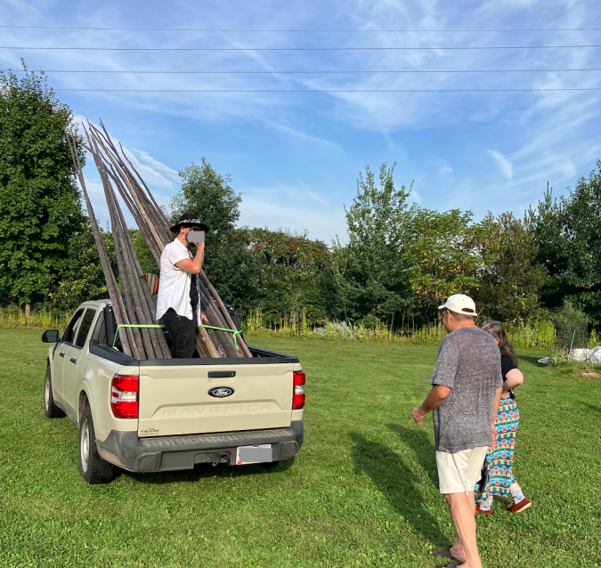 It was yet another stunning moment for the Ford Maverick. Assured that we didn’t have to go far or fast, I left with a small party and collected the very long poles. Ho-ly-shit, the little Mav did it again! We placed them carefully in the Mav-that-could, strapped them down, and then, slowly and carefully, we transported them to the grounds.